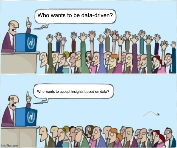 I'm not saying it’s terrible, but sometimes they will be just used as an excuse: “We have dashboards, we’re data-driven”, even though the whole dashboard is based on vanity metrics that don’t show how things are going. This makes sense when you consider why analysts focus a lot on visuals and dashboards - they’re optimising for success. People will remember the colourful and pretty dashboard, not when you tell them there are issues in some segment. Here is another edge of data literacy. People tend to think that they know things better with their gut feeling. There is no data to back my decisions, but I’ve been in the industry for X years and know what the market wants.